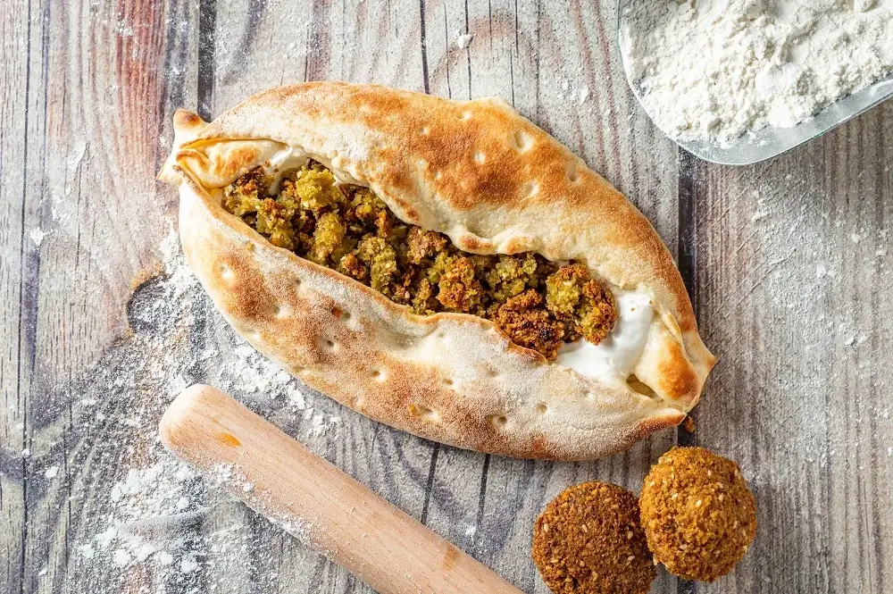 Fatayer Labneh Falafel blends creamy labneh with crispy falafel inside a baked pastry shell. This fusion provides contrast of textures and bold flavor.