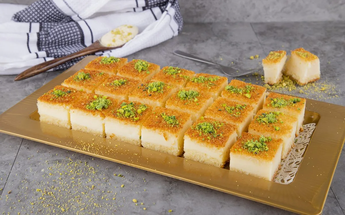 Savor the soft, sweet taste of BASBOUSA KISHTA, a delightful Middle Eastern dessert made from semolina, soaked in sugar syrup, and layered with smooth cheese kishta. Each bite offers a perfect blend of sweetness and creaminess, balancing traditional flavor with a rich, cheesy twist. This dessert is baked to golden perfection, creating a moist texture that melts in your mouth. Whether served warm or chilled, it is an ideal treat for family gatherings, festive tables, or after-dinner indulgence. Its creamy center and soft, syrupy layers make it a signature delight for those who love authentic Arabic sweets with a modern touch.